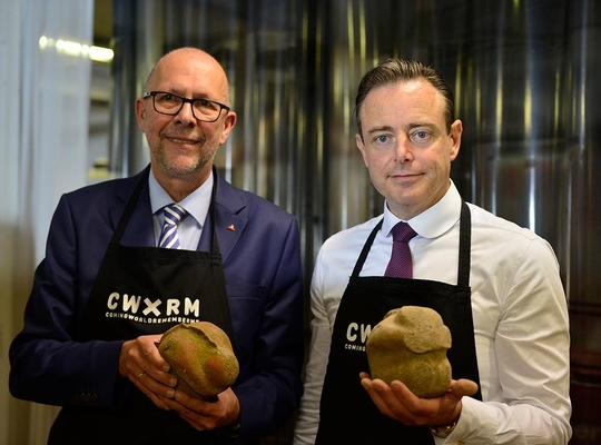 Gedeputeerde Luk Lemmens en burgemeester Bart De Wever tonen trots de eerste Antwerpse beeldjes voor Coming World Remember Me. Het herdenkingsproject voor Wereldoorlog I wordt georganiseerd door de provincie West-Vlaanderen en wordt ondersteund door de provincie Antwerpen en het Vredescentrum. Voor elk van de 600.000 slachtoffers in ons land zal een beeldje gemaakt worden.