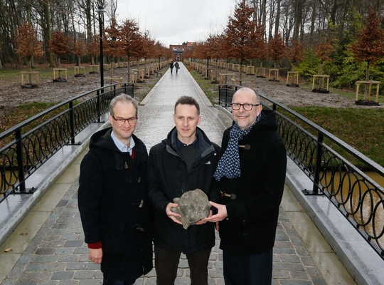 Gedeputeerde Luk Lemmens, districtsburgemeester van Deurne Tjerk Sekeris en directeur van het Rivierenhof Peter Verdyck poseren met een 22,5 miljoen jaar oude walviswervel op de nieuwe Jezuïetendreef in het Rivierenhof. De dreef kreeg nieuwe bomen, een nieuw pad en een nieuwe brug. Na zes maanden kunnen de parkbezoekers het park weer binnenkomen langs deze historische poort.
